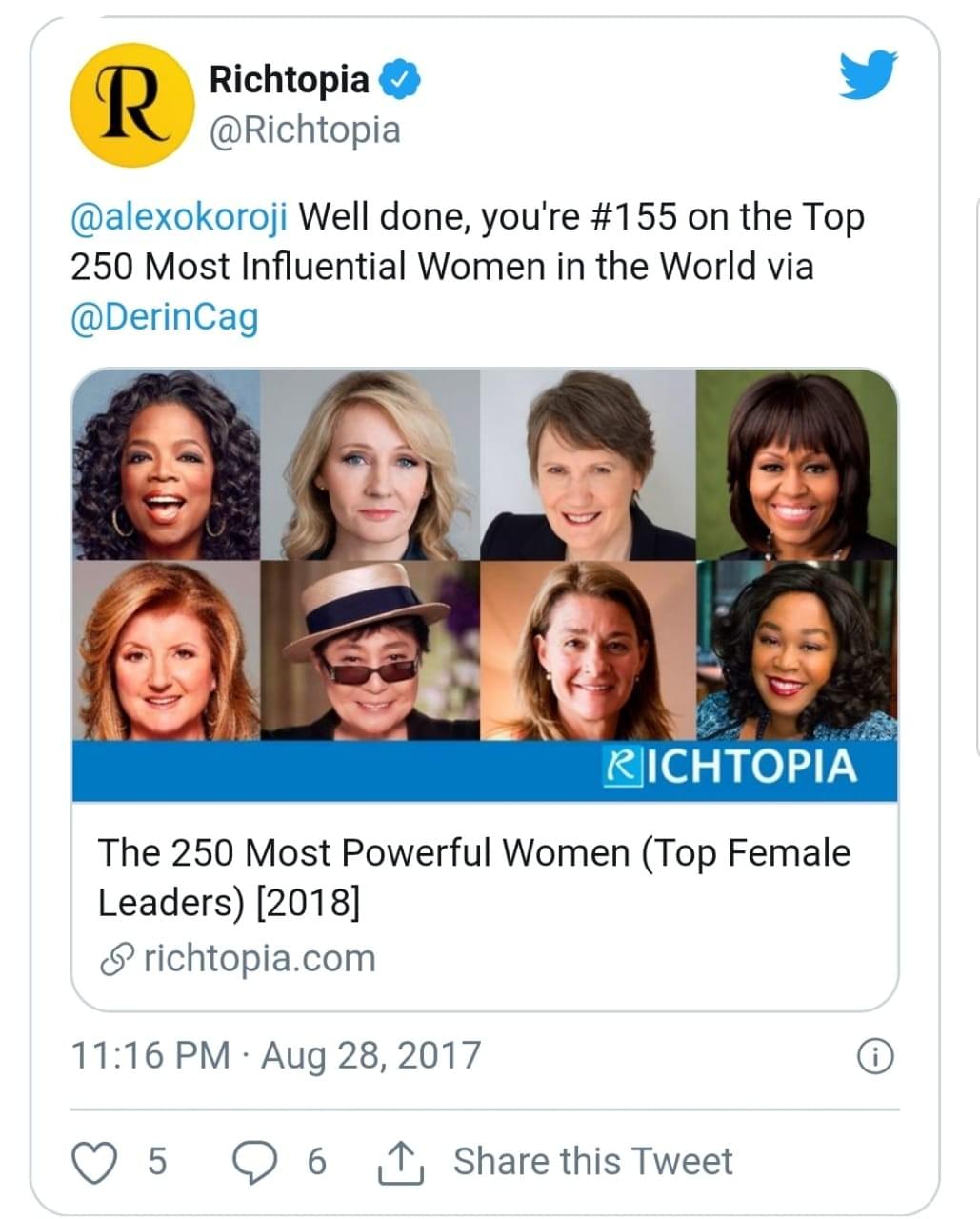 - Honored as one of the Top 250 Most Influential Women in the World (Richtopia, 2017–2019) alongside Michelle Obama, Oprah Winfrey, and Ngozi Okonjo-Iweala.
